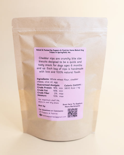 Nips are crunchy bite size treats made with simple,natural ingredients making them great for everyday treats for your pups ages 6 months and up.