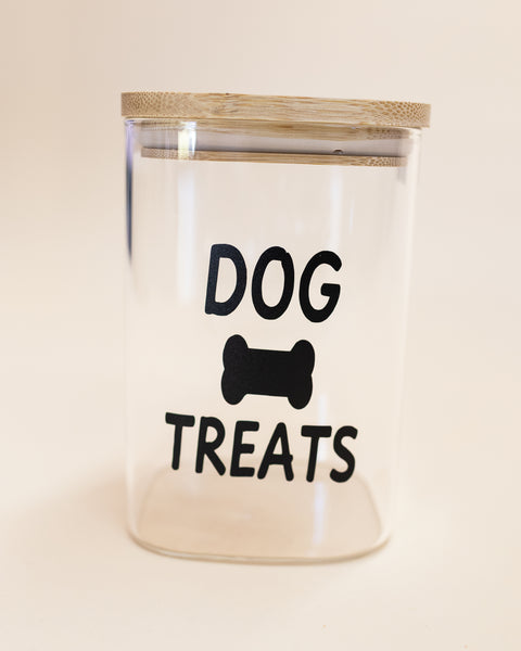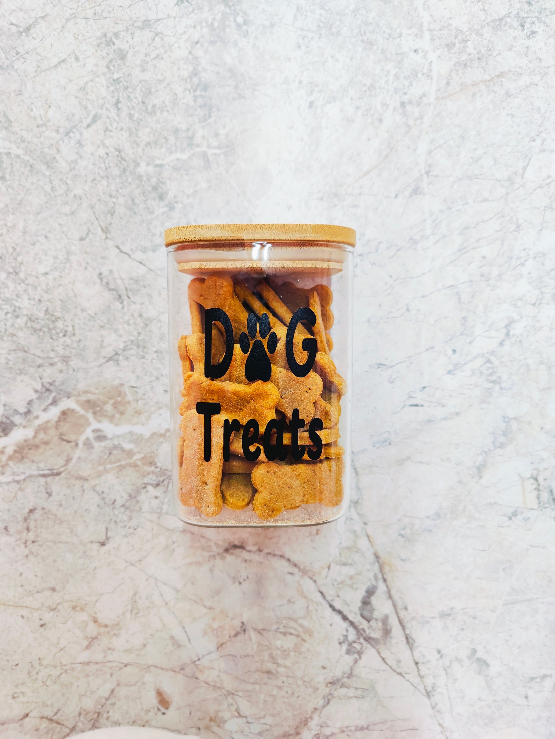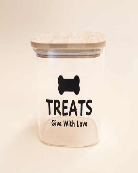 This glass treat jar holds 16oz worth of treats. Comes topped with an air tight bamboo lid, letters are permanent, waterproof vinyl.