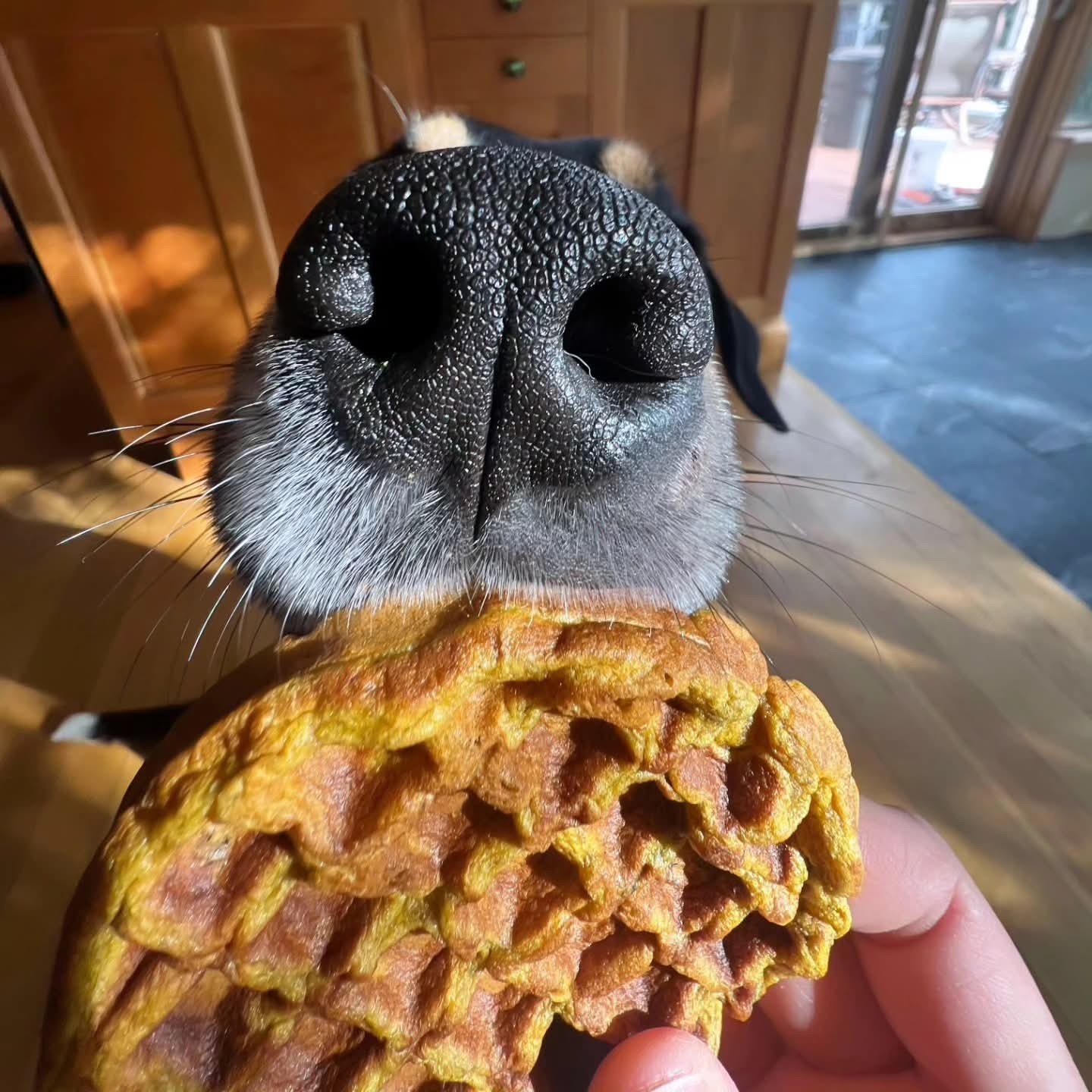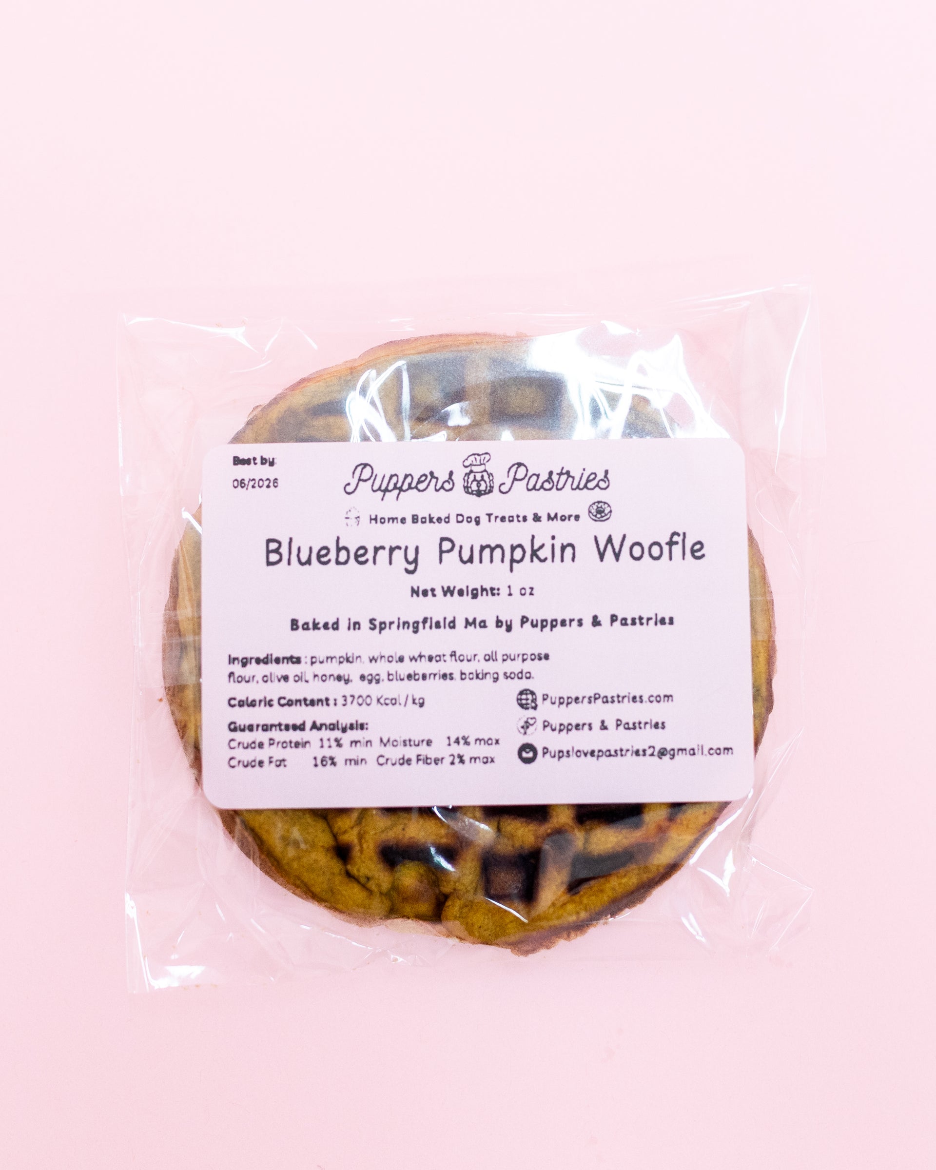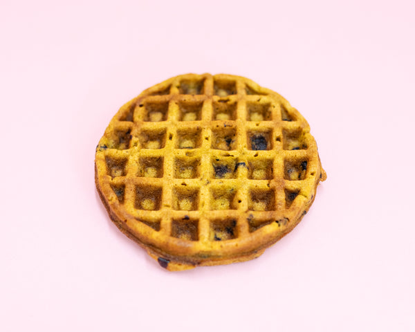 Woofles are waffles for dogs! Yummy but still nutritious made from a blend of blueberries, pumpkin, and whole wheat flour. Woofles have a chewy texture and can easily be broken up into pieces. They are slightly dehydrated to create a natural shelf life of 12 weeks.
